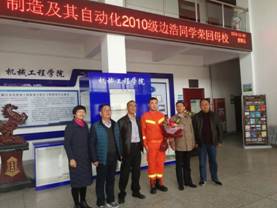 2018年11月9日下午16点,荣获“2017-2018大学生就业创业年度新闻人物”称号的雷速体育 机械设计制造及其自动化2010级优秀校友边浩同学在结束了雷速体育 “四爱三有”主题系列活动之先进事迹报告会后,在雷速体育 401会议室与雷速体育 师生开展了雷速体育 师生座谈会。雷速体育 贾红光书记,金培鹏院长,刘海雄副院长和雷速体育 学生管理部主任李文老师,以及边浩同学在校期间的任课老师及师生代表参加会议。